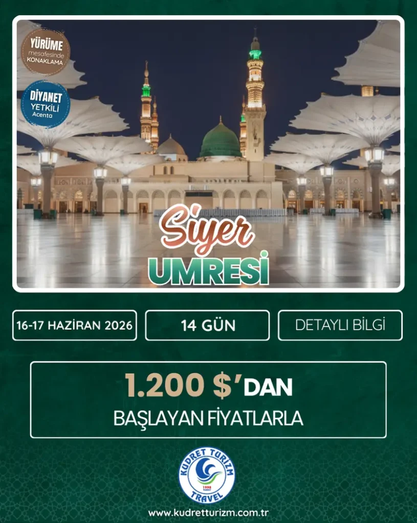 16-17 HAZİRAN 2026 SİYER UMRE PROGRAMI ARZIN MERKEZİNE YOLCULUK: KUDRET TURİZM İLE 14 GÜNLÜK SİYER UMRESİ BAŞLIYOR! Maneviyat ikliminde, Peygamber…