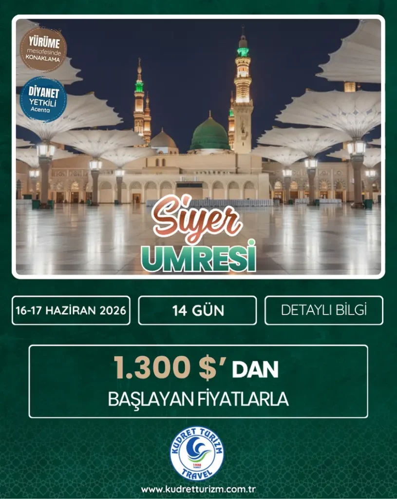 16-17 HAZİRAN 2026 SİYER UMRE PROGRAMI ARZIN MERKEZİNE YOLCULUK: KUDRET TURİZM İLE 14 GÜNLÜK SİYER UMRESİ BAŞLIYOR! Maneviyat ikliminde, Peygamber…